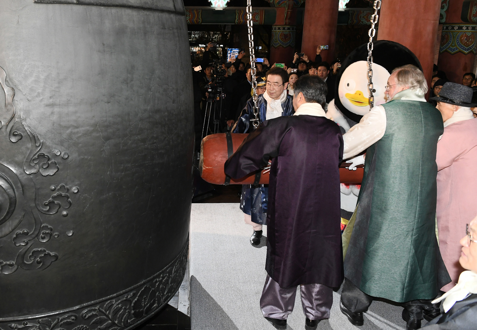 31일 자정 서울 종로 보신각 앞에서 2019년 제야의 종 타종에 나선 박원순 서울시장(가운데)과 야구선수 류현진(왼쪽 여섯째), EBS '자이언트펭TV'의 캐릭터 펭수(오른쪽 여덟째) 등이 참석하고 있다. 서울시 제공