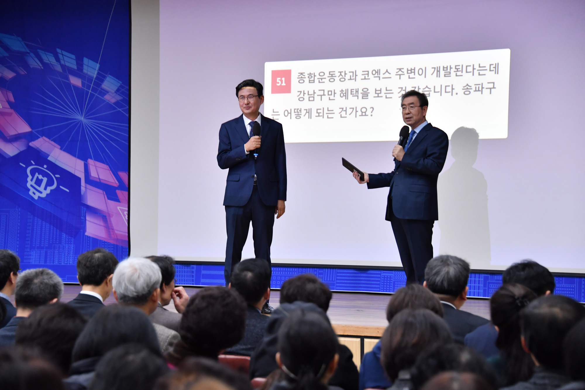 30일 오전 서울 송파구청 대강당에서 열린 ‘서울시장과 함께하는 송파구 2020 예산설명회’에서 박성수 구청장과 박원순 서울시장이 지역에서 추진하는 사업에 대해 의견를 나누고 있다. 서울시 제공