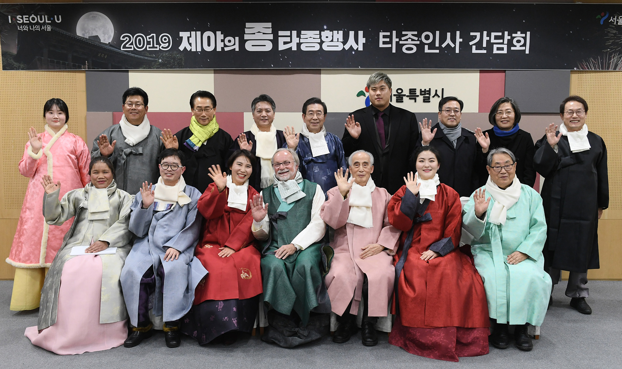 31일 자정 서울 종로 보신각 앞에서 2019년 제야의 종 타종에 나선 박원순 서울시장(가운데)과 야구선수 류현진(왼쪽 여섯째), EBS '자이언트펭TV'의 캐릭터 펭수(오른쪽 여덟째) 등이 참석하고 있다. 서울시 제공