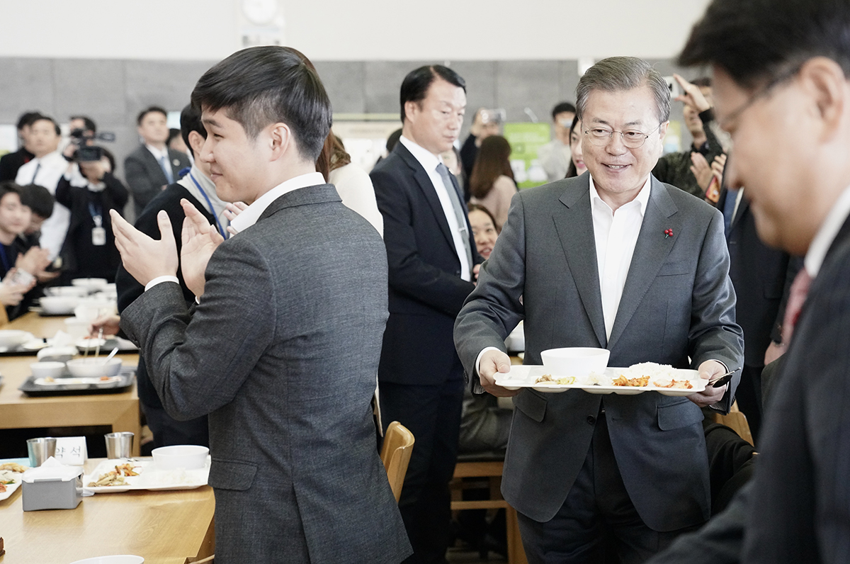 문재인 대통령이 21일 정부세종청사에서 국무회의를 마치고 구내식당에서 신임 공무원들과 점심 식사를 하기 위해 이동하고 있다