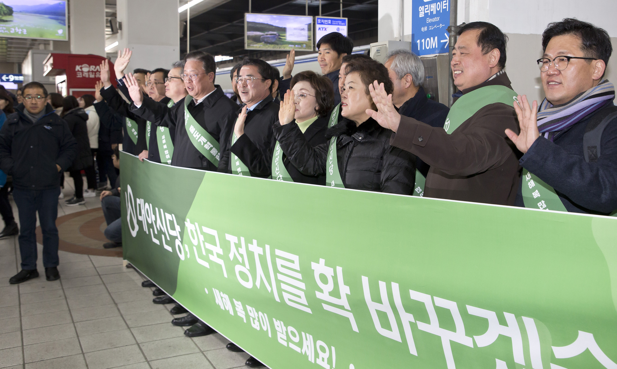 [eoimage=서울] 임준선 기자 = 23일 오전 용산역에서 대안신당 지도부가 귀성객들에게 인사를 하고 있다.