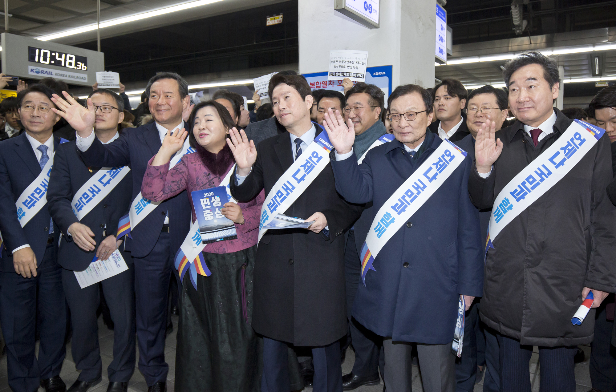 [eoimage=서울] 임준선 기자 = 23일 오전 용산역에서 더불어 민주당 이해찬 대표와 이낙연 전 국무총리, 이인영 원내대표 등 지도부가 귀성객들에게 인사를 하고 있다.