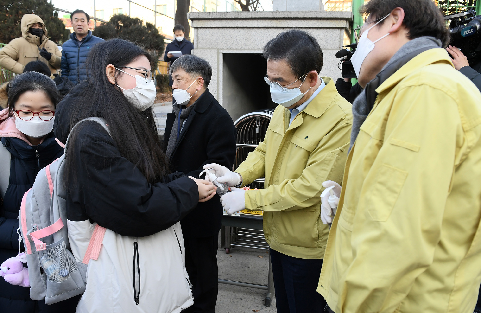 박원순 서울시장과 조희연 교육감이 6일 오전 서울 관악구 남부초등학교에서 신종 코로나 바이러스 감염증 예방 차원으로 등교하는 어린이들에게 손소독제를 뿌려주고 있다. 서울시 제공