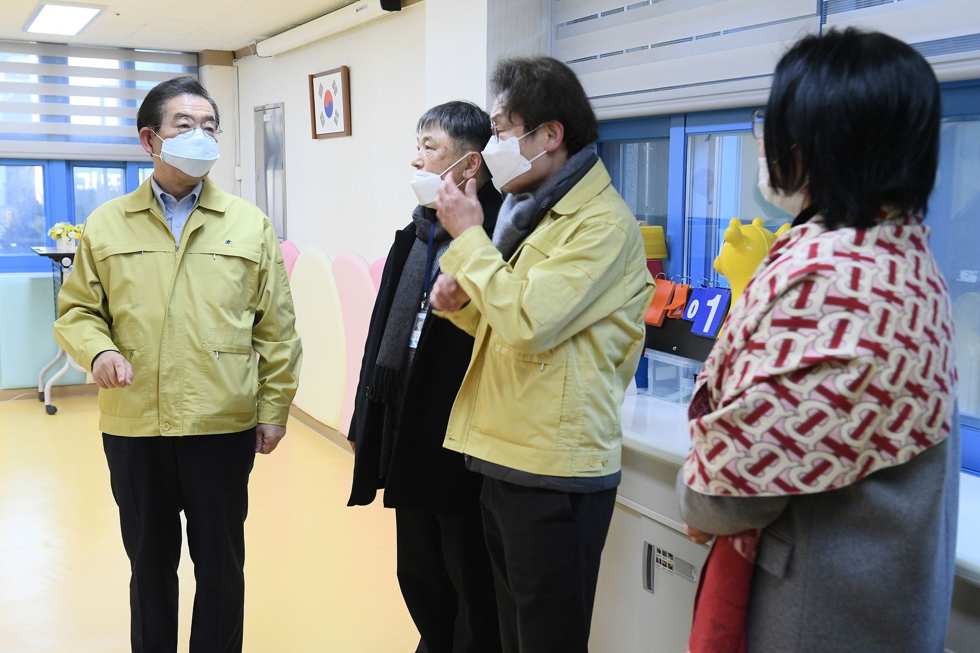 박원순 서울시장과 조희연 교육감이 6일 오전 서울 관악구 남부초등학교에서 신종 코로나 바이러스 감염증 예방 차원으로 등교하는 어린이들에게 손소독제를 뿌려주고 있다. 서울시 제공