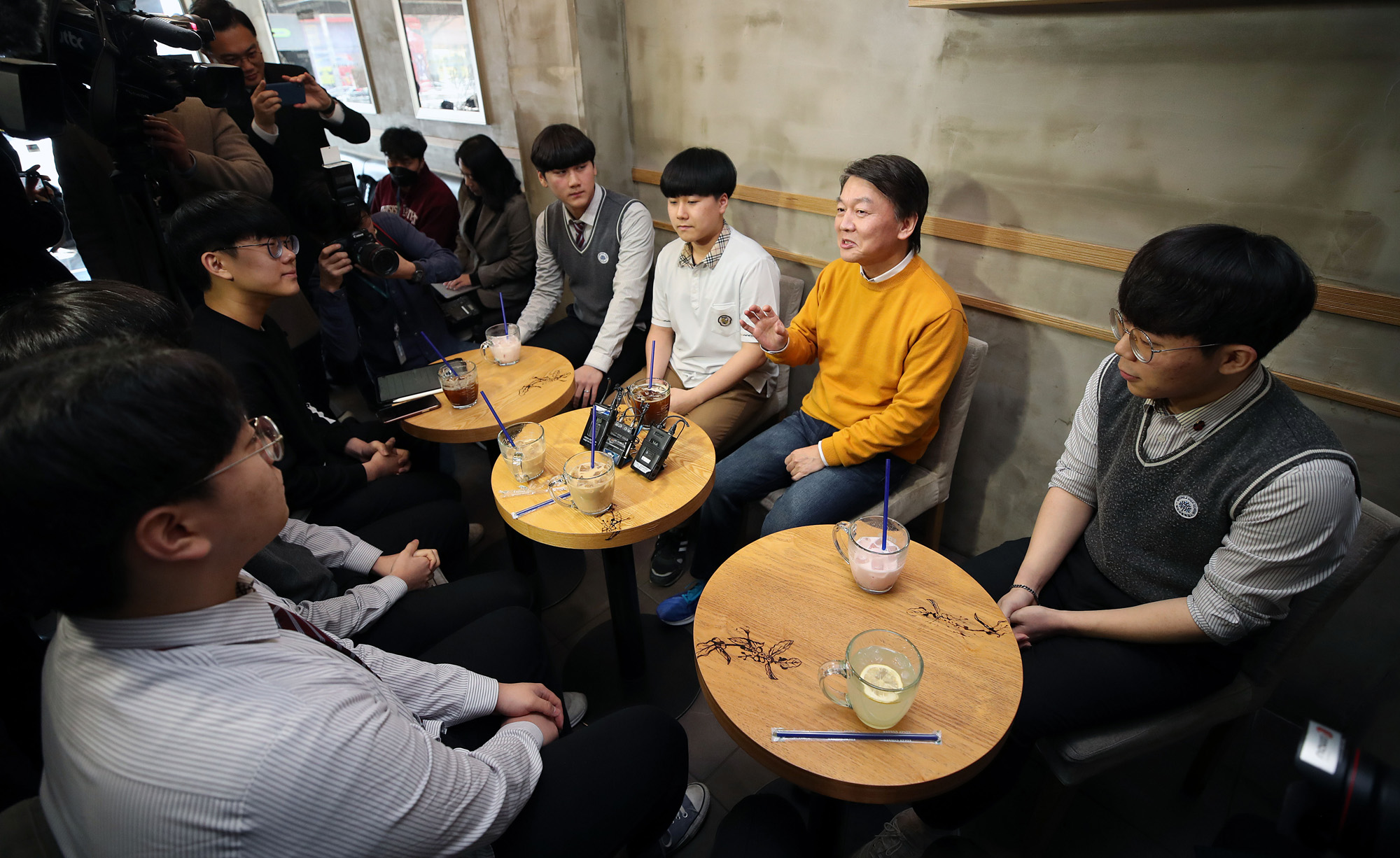 안철수 국민당 창당준비위원장이 10일 오후 서울 이디야커피 명지전문대점에서 '내일의 YOUTH(유스), 18세 유권자들과의 간담회'를 갖고 대화를 나누고 있다.