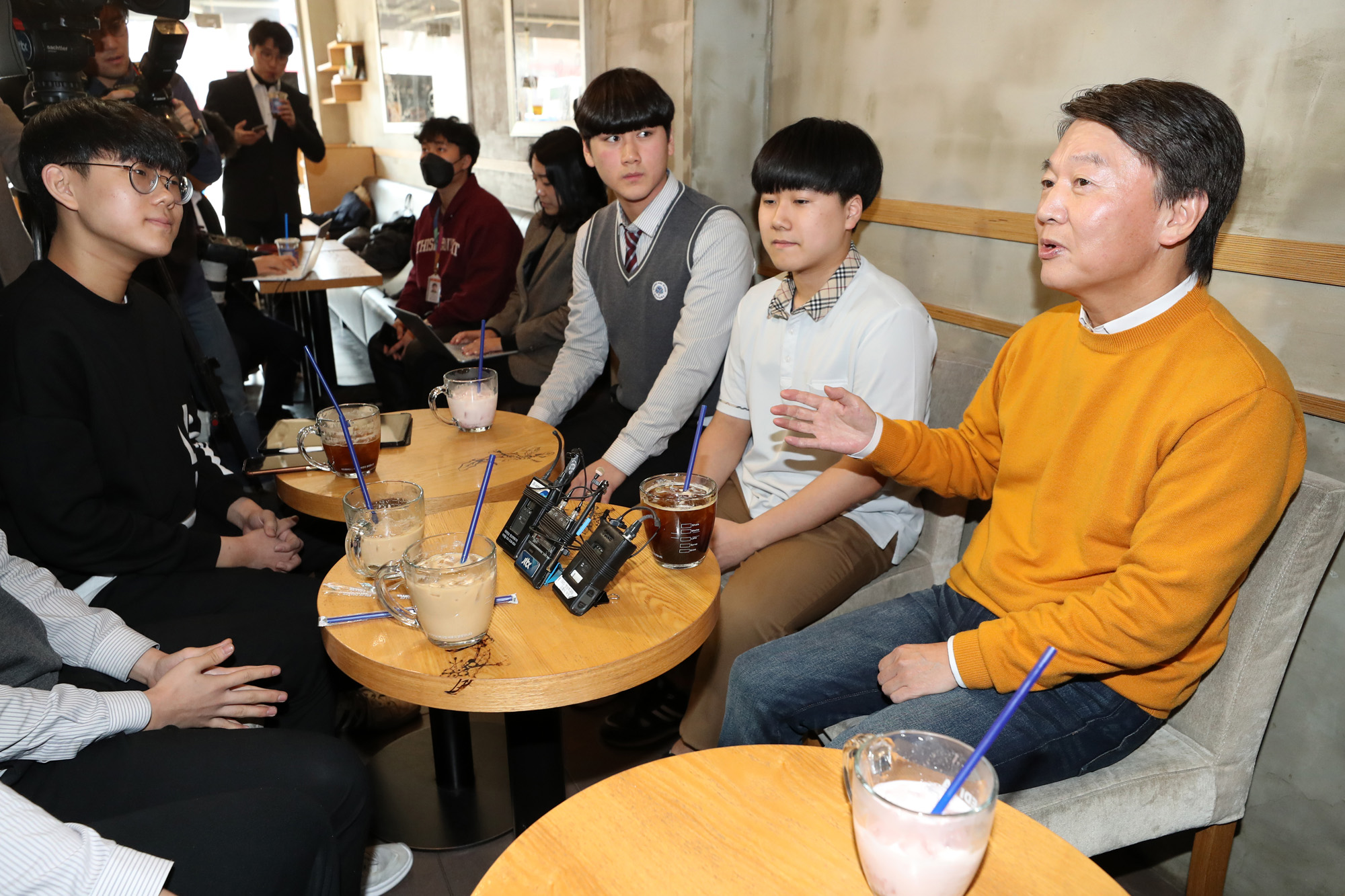 안철수 국민당 창당준비위원장이 10일 오후 서울 이디야커피 명지전문대점에서 '내일의 YOUTH(유스), 18세 유권자들과의 간담회'를 갖고 대화를 나누고 있다.