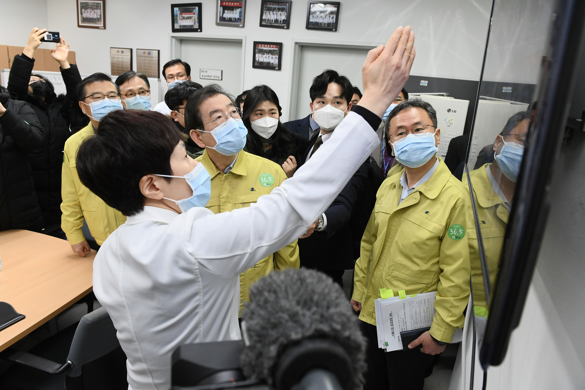 박원순 서울시장이 18일 서울 중랑구 서울의료원 신종 코로나바이러스 감염증(코로나19) 종합대책본부에서 의료진을 격려하고 있다. 서울시 제공