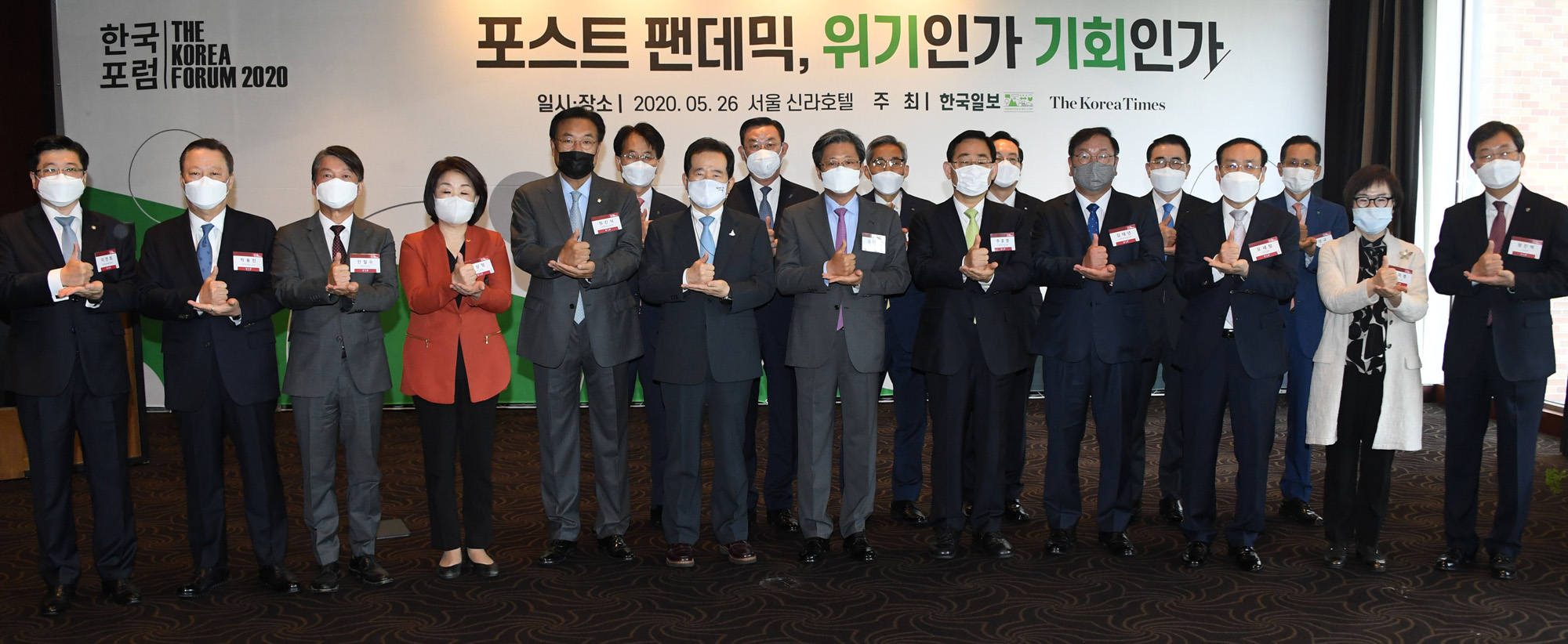 ‘2020 한국포럼’ 개막에 앞서 참석한 정세균 국무총리, 승명호(앞줄 왼쪽6번째) 한국일보 회장 등 주요인사들이 코로나19 진료를 위해 혼신의 힘을 다하고 있는 의료진을 격려하는 차원에서 '덕분에 챌린지' 동참을 하고 있다. 2020.05.26. 국회사진취재단