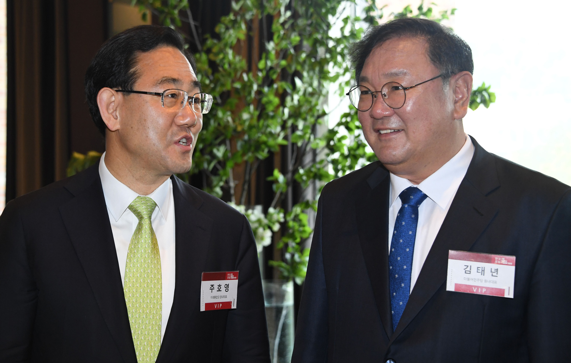 ‘2020 한국포럼’ 이 25일 신라호텔에서 열린 가운데 참석한 주호영 미래통합당, 김태년 더불어민주당 원내대표가 대화를 나누고 있다. 2020.05.26. 국회사진취재단