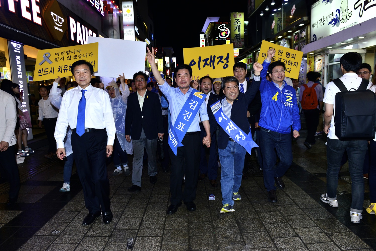 이재정 경기도교육감후보가 3일 수원역 앞에서 저녁 마지막 6.4 지방선 거리유세를 마치고 인근에서 유세 중이던 김진표 새정치민주연합 경기도지사후보와 손학규 공동선대위원장,염태영 수원시장후보와 함께 유권자의 환호에 손을 들어 답례하고 있다.