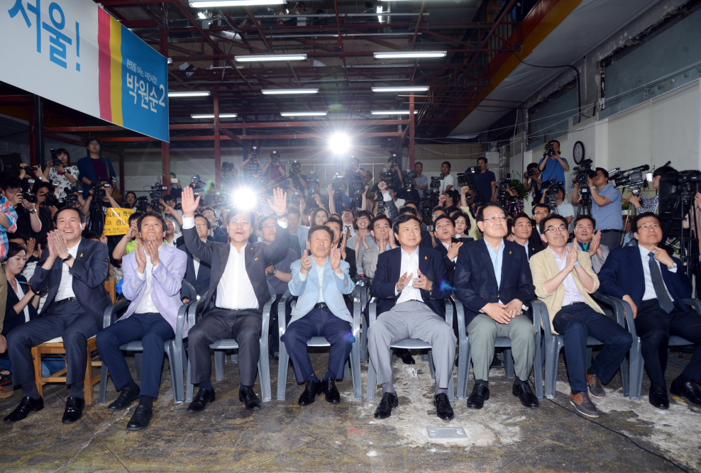 [서울=eoimage] 최준필 기자 = 제6회 전국동시지방선거 투표가 마감된 4일 오후 서울 종로구 박원순 선거캠프에서 지지자들이 박 후보의 출구 조사 결과를 접한 뒤 환호하고 있다. 14.06.04. eomaster@eoimage.com