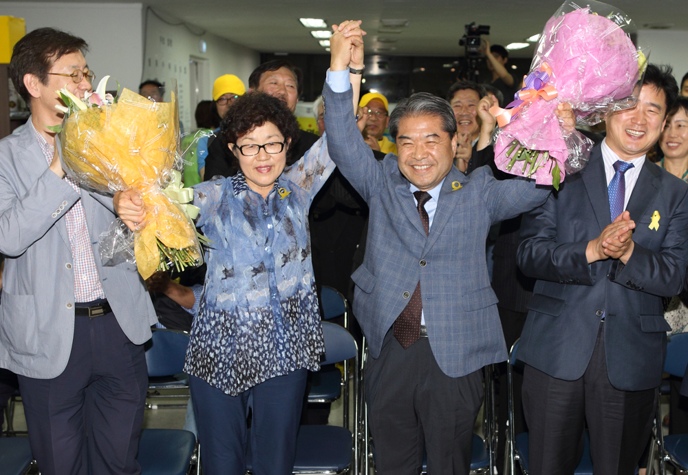 경기도교육감 이재정 후보가 부인 박영희씨와 당선 확정을 확인하고 지지자들과 함께 환호하고있다.