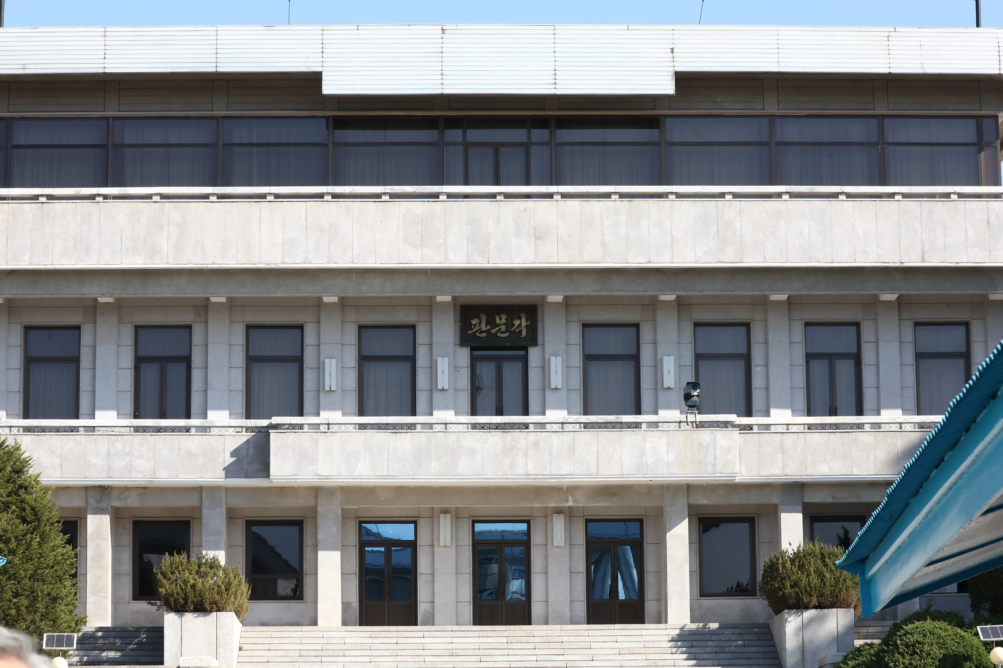 판문점 시범견학단이 참석자들이 4일 오전 경기도 파주시 판문점의 견학지원센터 개소식을 마치고 T2(군사정전위원회 본회의실) 회의실을 둘러보는 가운데 북측 판문각은 고요한 정막이 흐르고 있다.