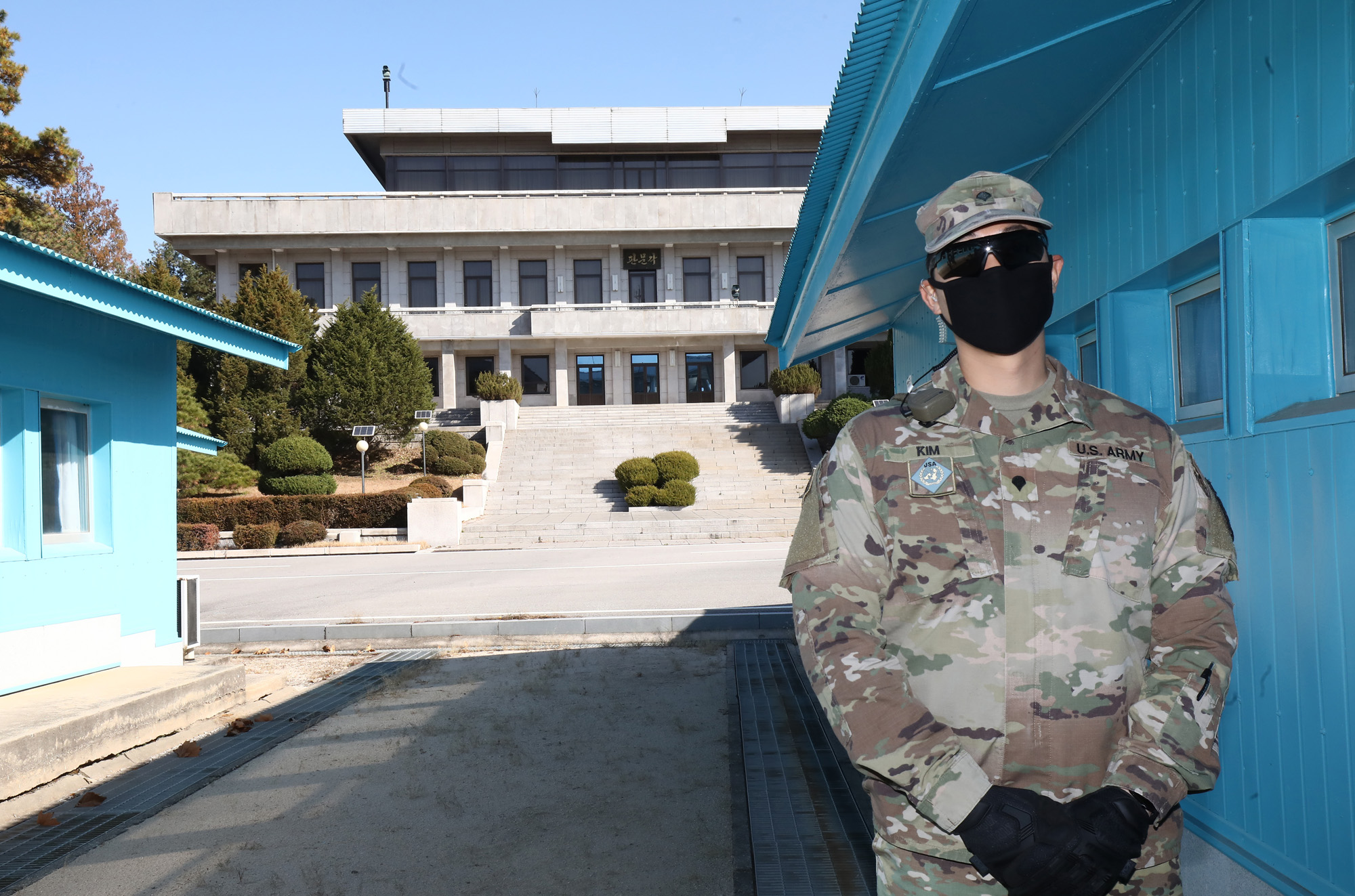 판문점 시범견학단이 참석자들이 4일 오전 경기도 파주시 판문점의 견학지원센터 개소식을 마치고 T2(군사정전위원회 본회의실) 회의실을 둘러보는 가운데 북측 판문각은 고요한 정막이 흐르고 있다.