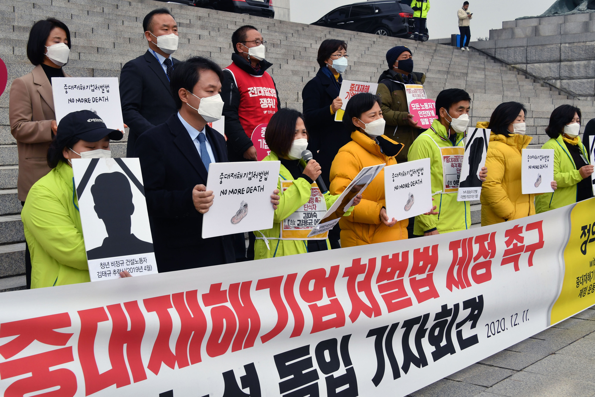 중대재해기업처벌법 제정 촉구 정의당 단식농성 돌입 기자회견이 11일 국회 본청 현관 앞에서 열려 고 김용균씨의 모친인 김미숙씨(앞줄 왼쪽 세번째)가 발언하고 있다. 사진=서동일 기자