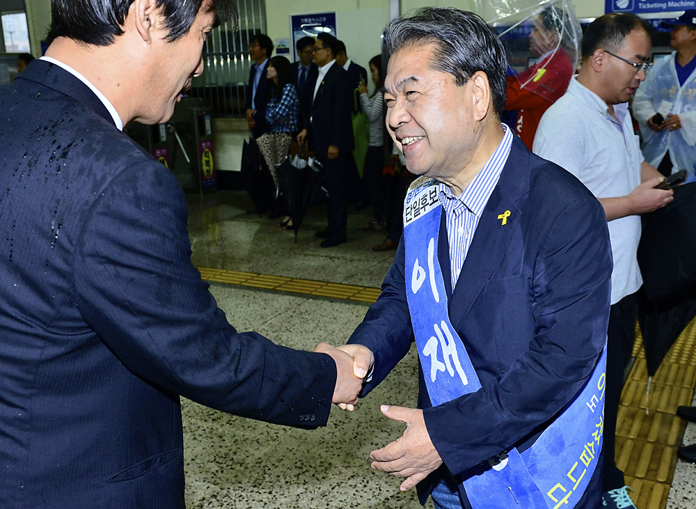 *_DSC6169:이재정 경기도교육감후보가 3일 오전 수원시 율전동 성균관대역 앞에서 시민들에게 출근인사를 하고 있다.
