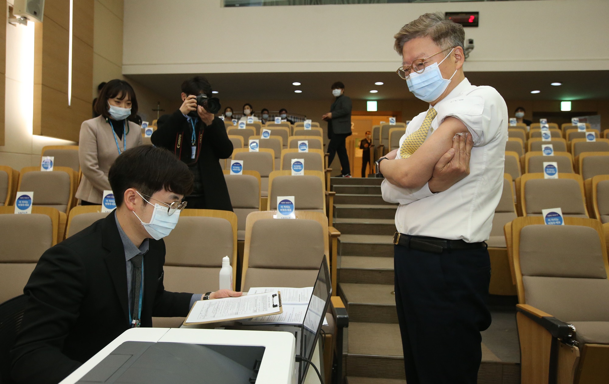 김연수 서울대학교병원장이 4일 오전 서울 종로구 서울대어린이병원 임상강의실에서 아스트라제네카(AZ) 신종 코로나바이러스 감염증(코로나19) 백신 1차접종을 한 뒤 등록을 하고 있다. 이날 김 병원장은 국내 '빅5'로 불리는 상급종합병원 중 처음으로 백신을 접종했다. 20210304사진공동취재단 |