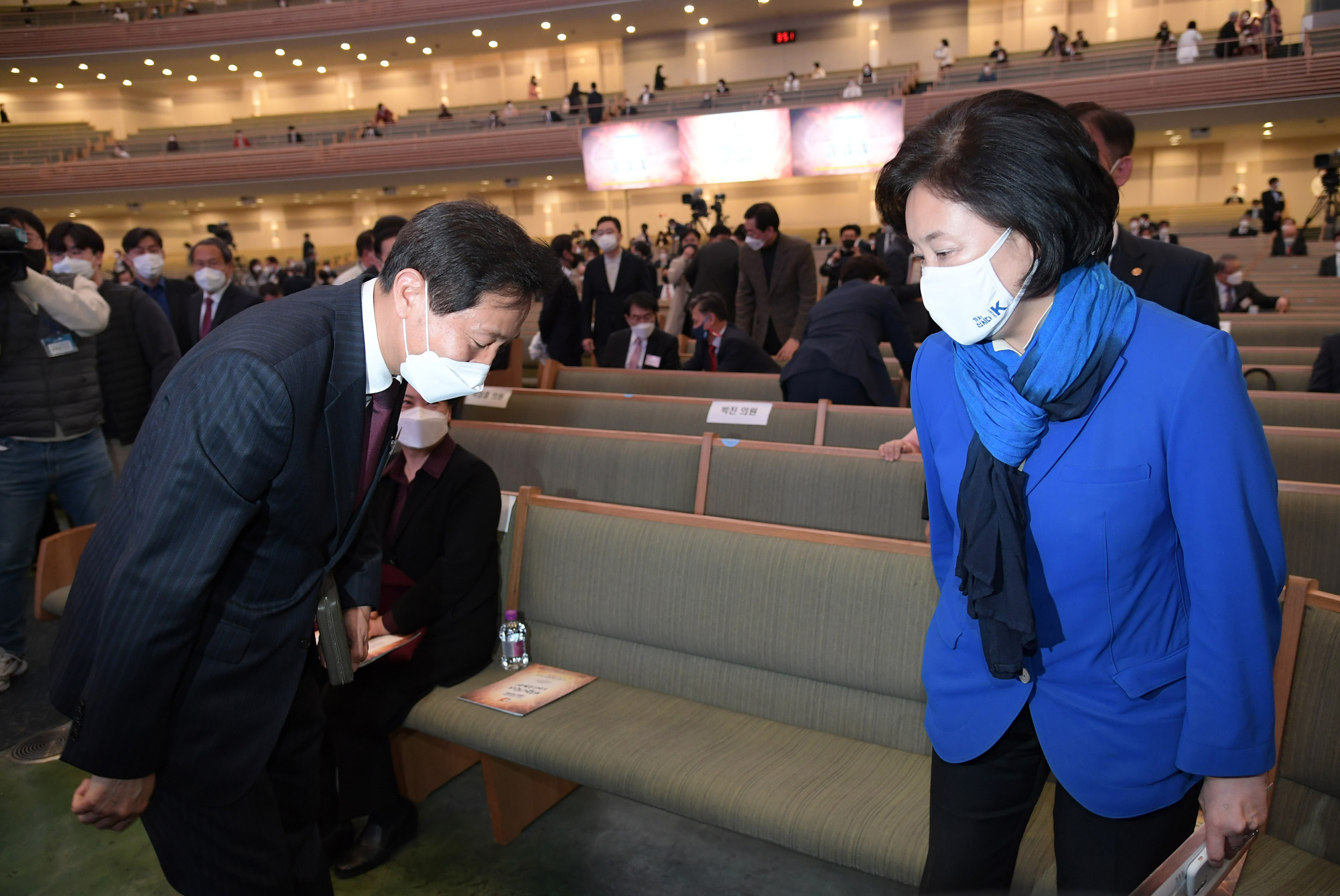 4일 서울 서초구 사랑의교회에서 열린 '2021 한국교회 부활절 연합예배'에 참석한 국민의힘 오세훈 서울시장 후보(왼쪽)와 더불어민주당 박영선 서울시장 후보(오른쪽)가 인사하고 있다. 2021.04.04. 국회사진취재단