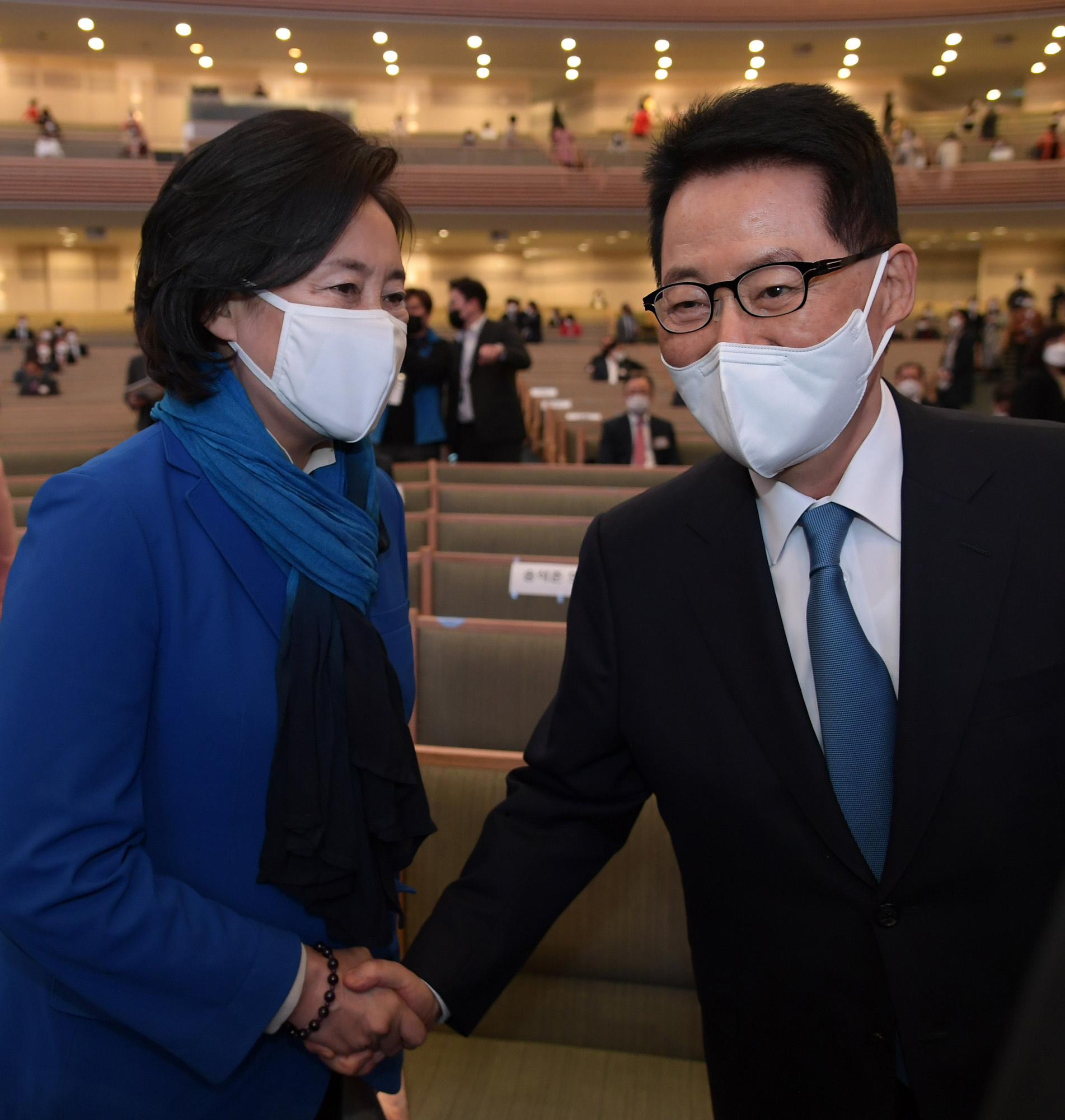 더불어민주당 박영선 서울시장 후보와 박지원 국정원장이 4일 서울 서초구 사랑의교회에서 열린 한국교회 부활절 연합예배에서 악수를 하고 있다. 2021.04.04. 국회사진취재단
