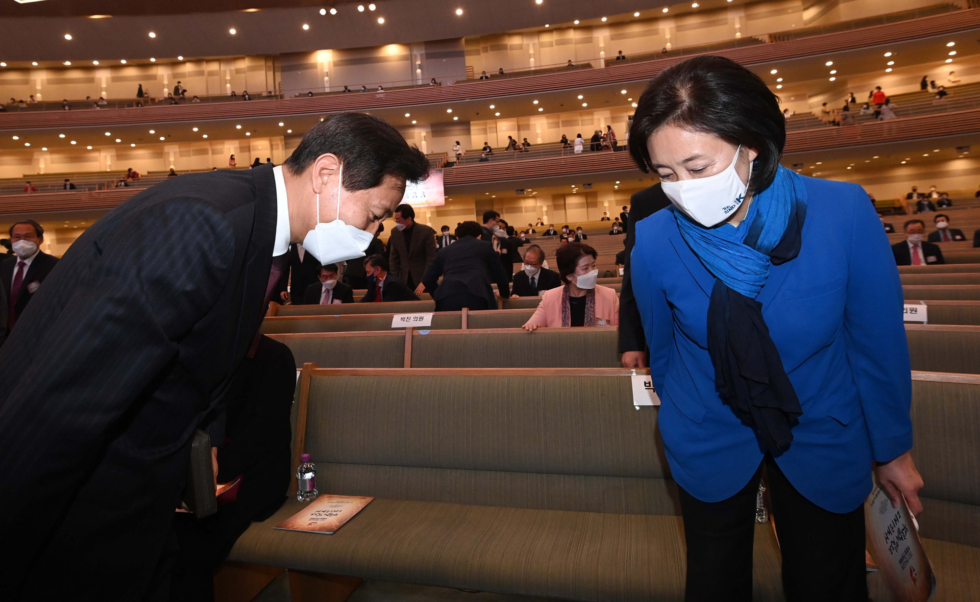 4일 서울 서초구 사랑의교회에서 열린 '2021 한국교회 부활절 연합예배'에 참석한 국민의힘 오세훈 서울시장 후보(왼쪽)와 더불어민주당 박영선 서울시장 후보(오른쪽)가 인사하고 있다. 2021.04.04. 국회사진취재단