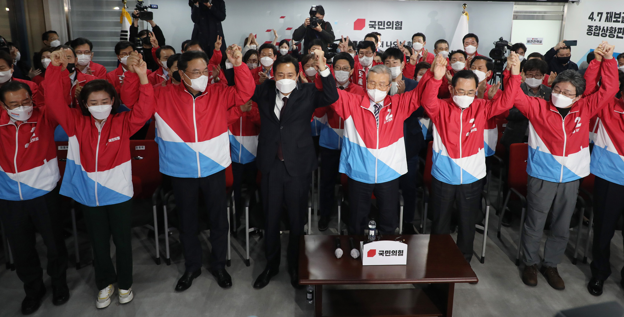 오세훈 국민의힘 서울시장 후보와 김종인 국민의힘 비상대책위원장이 7일 오후 서울 여의도 국민의힘 중앙당사에 마련된 개표상황실에서 4·7재보선 출구조사 결과를 바라보며 두손을 들어 환호하고 있다.