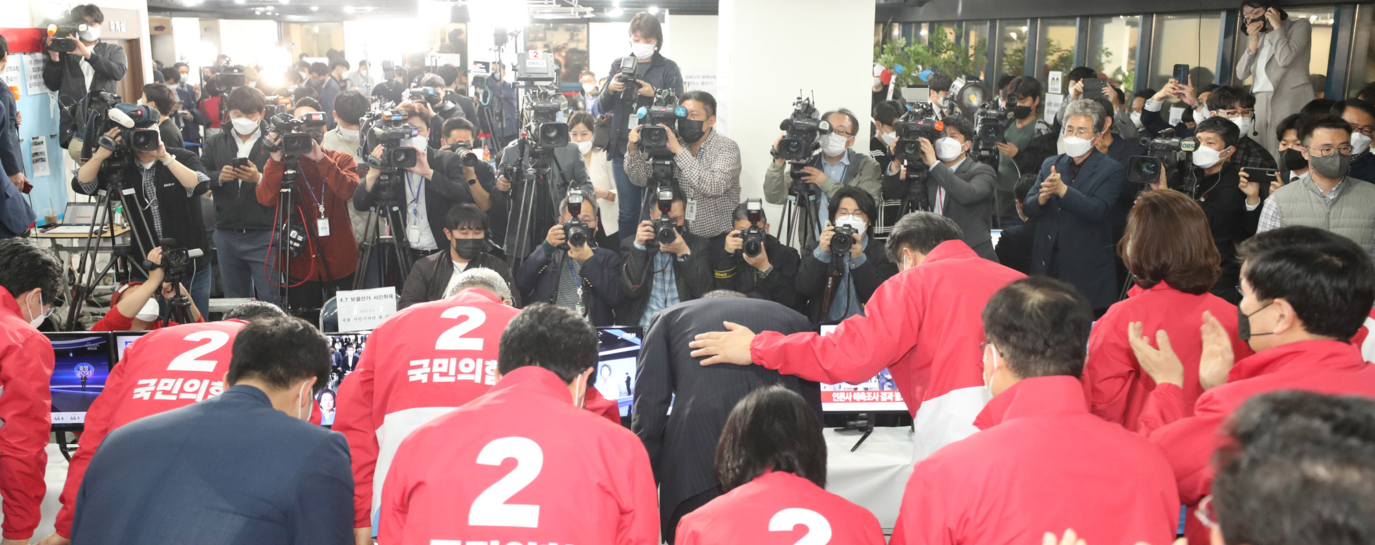 오세훈 국민의힘 서울시장 후보가 김종인 비대위원장과 7일 서울 여의도 중앙당사에 마련된 상황실에서 4·7 재보궐선거 방송사 출구조사가 앞선 것으로 나오자 인사하고 있다.