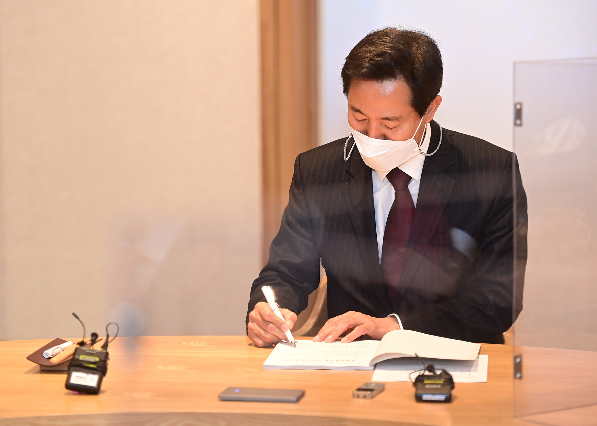 오세훈 서울시장 당선인이 8일 오전 서울 중구 서울시청 6층 집무실에서 사무 인계인수 책자에 서명을 하고 있다.