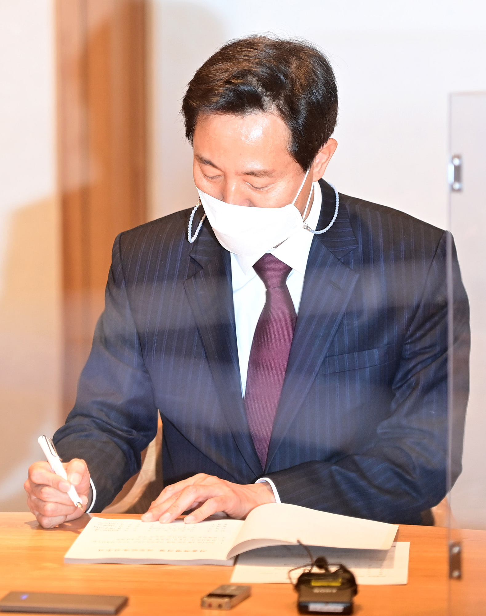 오세훈 서울시장 당선인이 8일 오전 서울 중구 서울시청 6층 집무실에서 사무 인계인수 책자에 서명을 하고 있다.