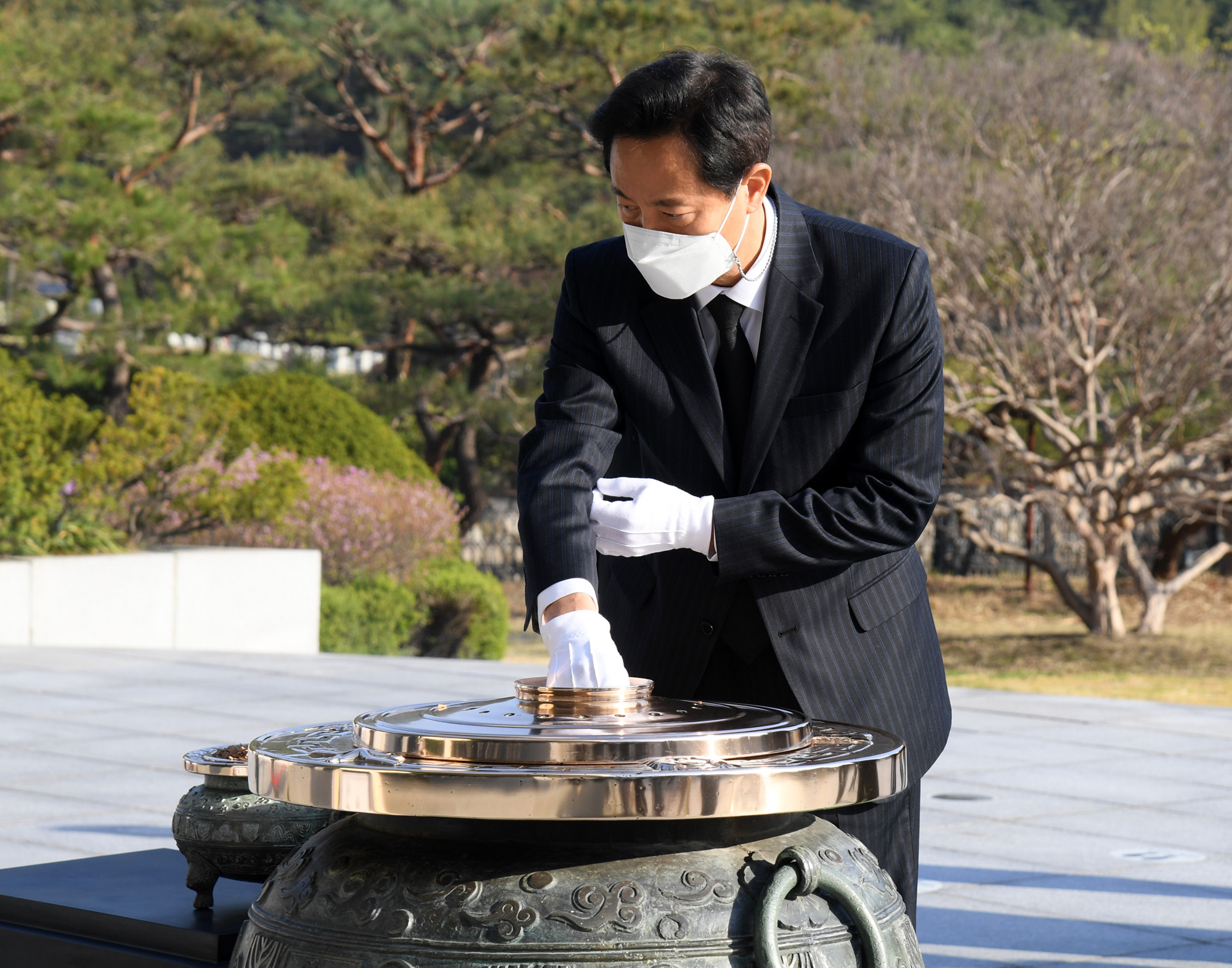 신임 오세훈 서울시장이 8일 서울 국립현충원을 찾아 참배하고 있다. 2021.04.08. 서울시 제공