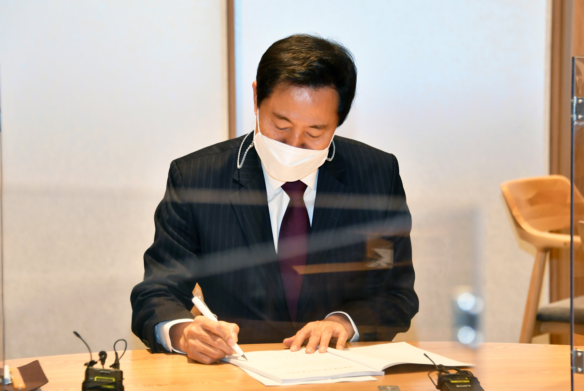 제38대 서울특별시장에 당선된 오세훈 시장이 8일 오전 서울 중구 서울시청으로 첫 출근, 사무 인계·인수서에 서명하고 있다. 2021.04.08. 서울시 제공