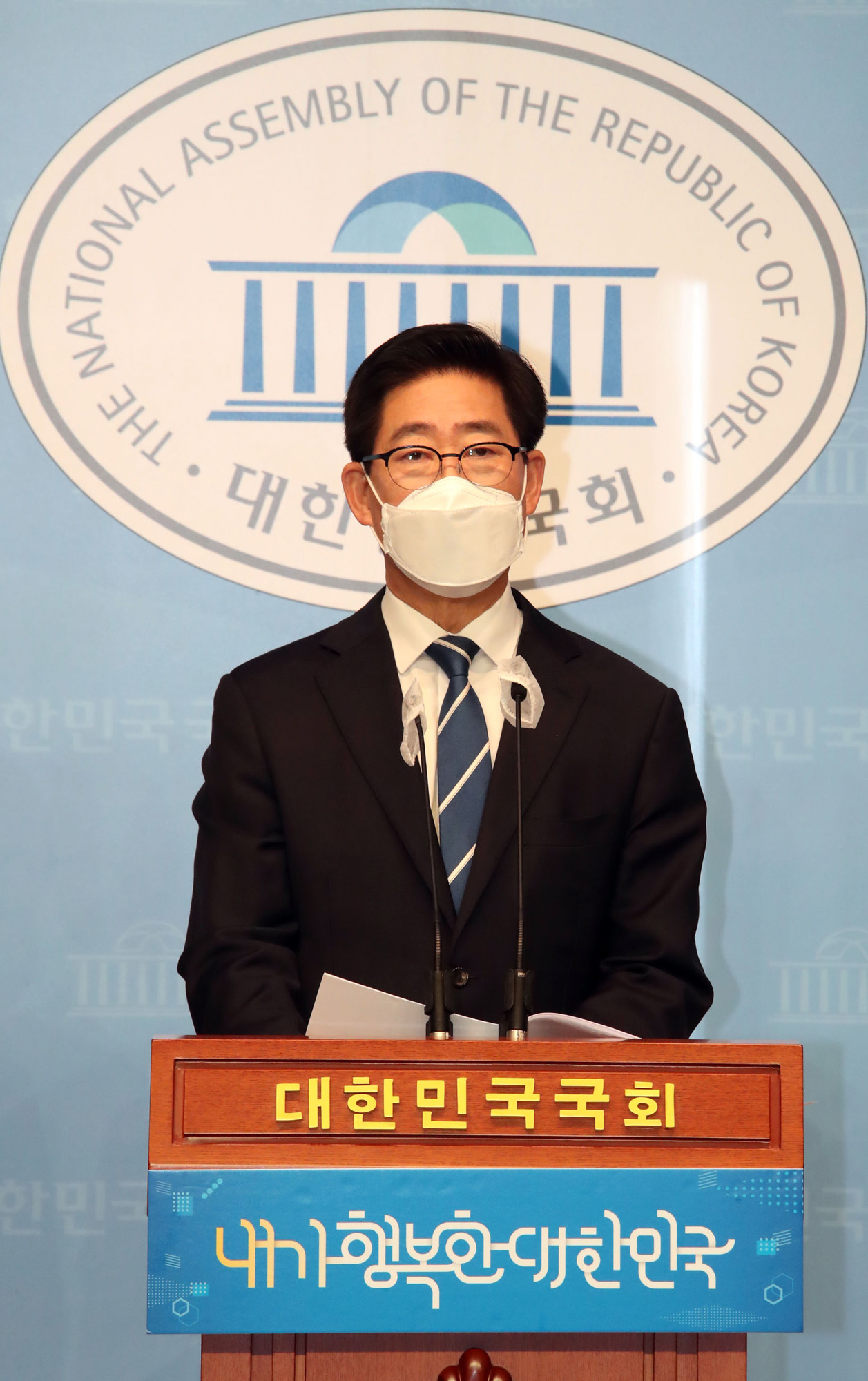 양승조 충남도지사가 28일 국회 소통관에서 제20대 대통령 선거 1차 공약발표를 하고 있다. 이날 양 지사는 국가균형발전 1탄 으로 '법인세 지방 차등화, 수도권 3기 신도시 건설 반대, 충남형 더 행복한 주택 의 전국화' 를 발표했다.