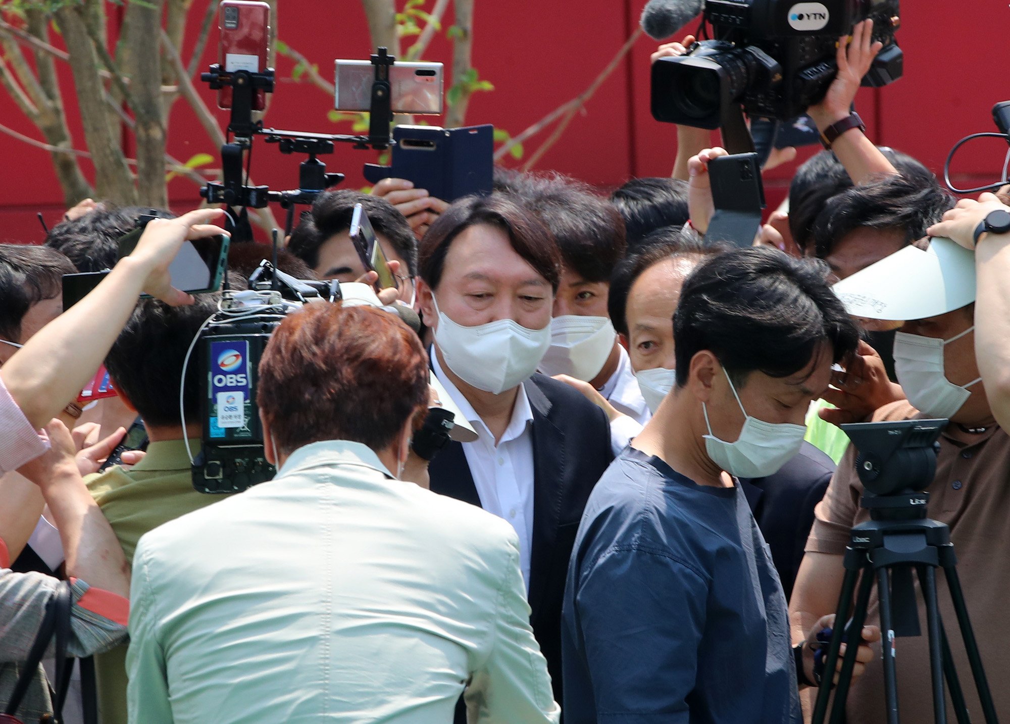 윤석열 전 검찰총장이 지지자들과 취재진에 둘러쌓인 채 9일 서울 중구 남산예장공원에서 열린 독립운동가 우당 이회영 선생 기념관 개관식에 참석하고 있다.