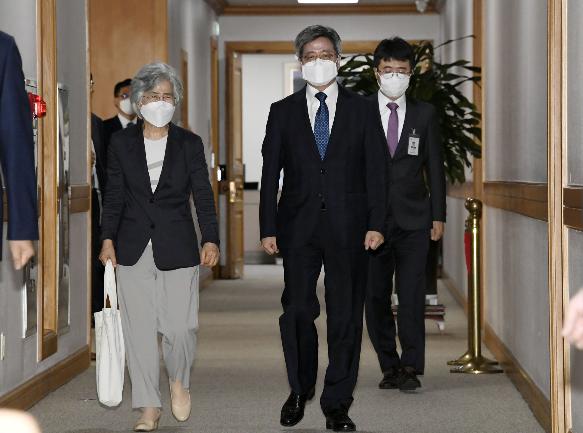 김명수 대법원장이 박은정 위원장과 함께 29일 서초구 대법원에서 열린 ‘대법관후보추천위원회’ 회의에 앞서 대법관후보추천위원들을 접견하기 위해 들어서고 있다. 2021.07.29. 사진=사진공동취재단