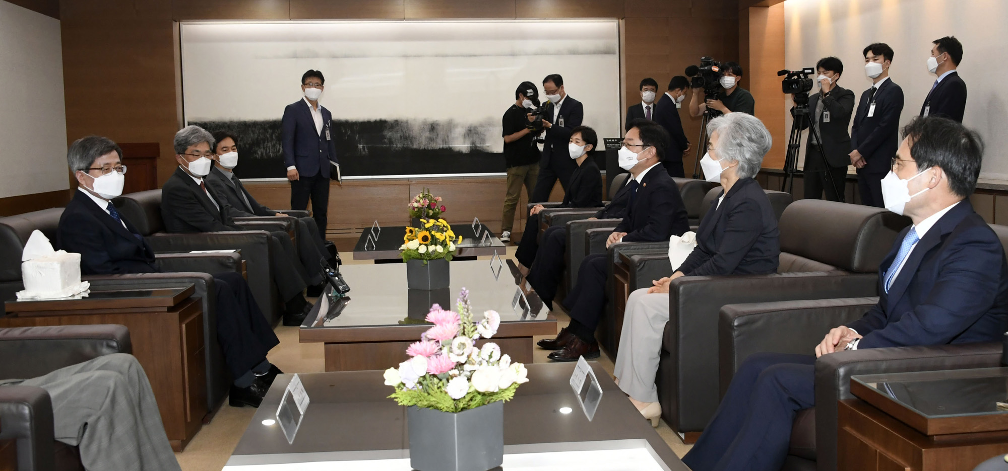 김명수 대법원장이 29일 서초구 대법원에서 열린 ‘대법관후보추천위원회’ 회의에 앞서 박은정 위원장, 박범계 장관을 비롯한 대법관후보추천위원들을 접견하고 있다. 2021.07.29. 사진=사진공동취재단
