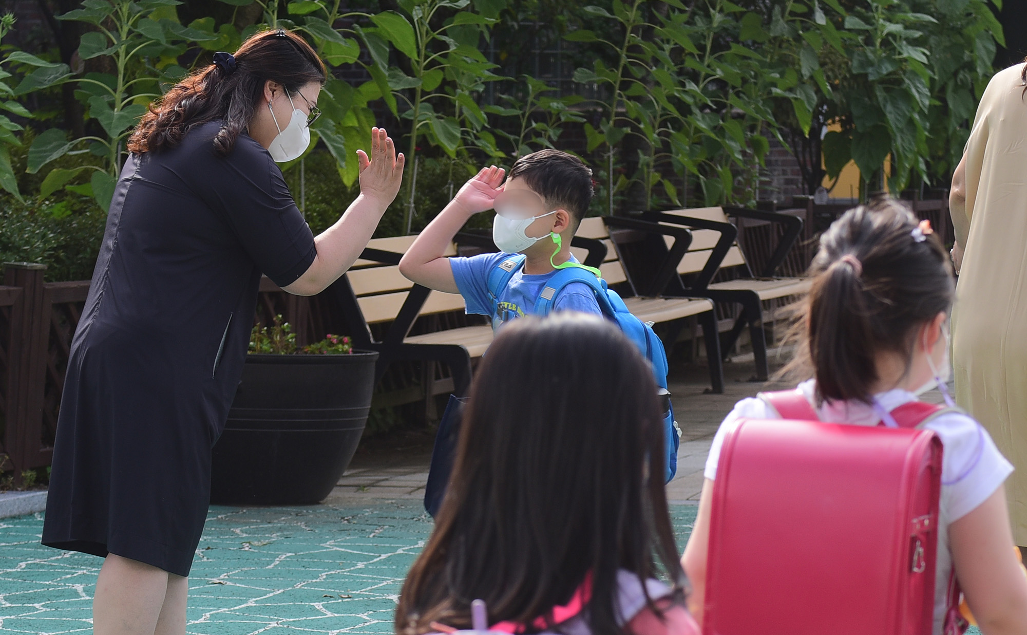 2학기 개학이 시작된 17일 오전 서울 마포구 성원초등학교에서 1,2학년 학생들이 등교하고 있다. 교육부의 2학기 등교 확대 방침에 따라 개학과 동시에 사회적 거리두기 4단계에서도 등교수업이 이뤄진다. 2021.08.17. 사진공동취재단