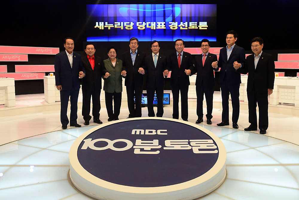 | 사진설명 | 새누리당 7·14 전당대회 후보자 1차 TV토론회가 8일 오후 여의도 MBC에서 열렸다. TV토론회에 참석한 후보자들이 토론회에 앞서 자리를 함께하고 있다. 이날 토론회에 참석한 9명의 전당대회 주자들은 밤 12시 MBC 100분 토론을 통해 표심 몰이에 나설 예정이다. 사진왼쪽부터 박창달, 이인제, 김을동, 김무성, 김영우, 서청원, 김상민, 김태호, 홍문종. 14.07.07. 사진공동취재단 |