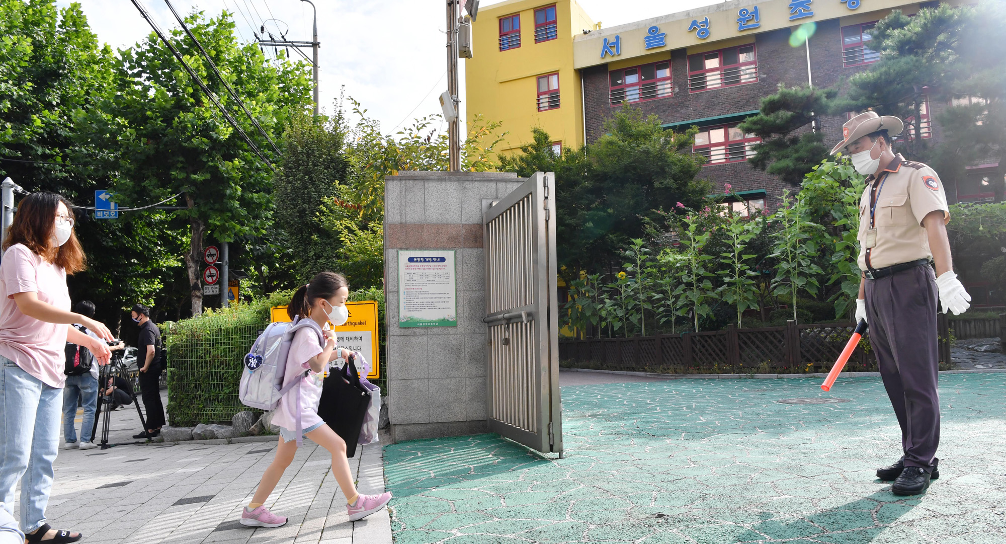 2학기 개학이 시작된 17일 오전 서울 마포구 성원초등학교에서 1,2학년 학생들이 등교하고 있다. 교육부의 2학기 등교 확대 방침에 따라 개학과 동시에 사회적 거리두기 4단계에서도 등교수업이 이뤄진다. 2021.08.17. 사진공동취재단