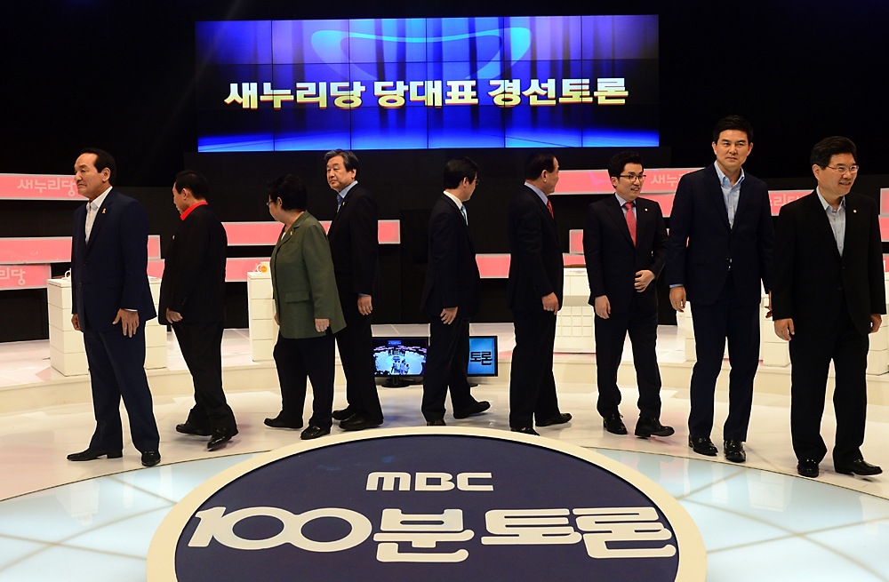 새누리당 7·14 전당대회 후보자 1차 TV토론회가 8일 오후 여의도 MBC에서 열렸다. TV토론회에 참석한 후보자들이 토론회에 앞서 포토타임을 가진 후 자리로 돌아가고 있다. 이날 토론회에 참석한 9명의 전당대회 주자들은 밤 12시 MBC 100분 토론을 통해 표심 몰이에 나설 예정이다. 사진왼쪽부터 박창달, 이인제, 김을동, 김무성, 김영우, 서청원, 김상민, 김태호, 홍문종. 14.07.07. 사진공동취재단 |