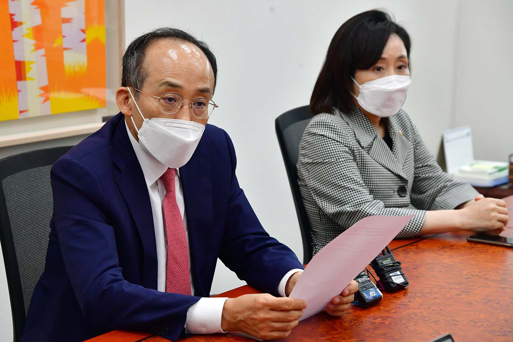 | 사진설명 | 국민의힘 추경호 원내수석부대표가 7일 국회에서 언론중재법 관련 8인 협의체의 국민의힘 추천 명단을 발표하고 있다. (추천 명단으로 당내에서는 최형두, 전주혜 의원과 외부 전문가로 문재완 한국외대 법학전문대학원 교수와 신희석 전환기정의워킹그룹 법률분석관을 지명했다.) |