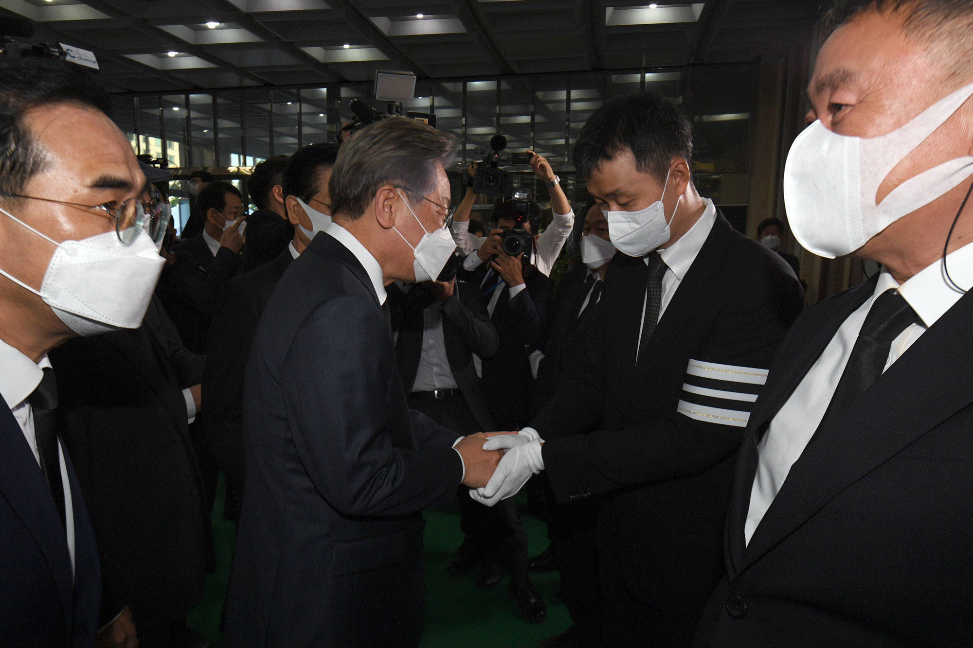 이재명(왼쪽 두번째) 더불어민주당 경선 후보가 15일 서울 여의도순복음교회 대성전 1층 베다니홀에 마련된 고 조용기 원로목사의 빈소에서 조민제 국민일보 회장과 인사하고 있다.