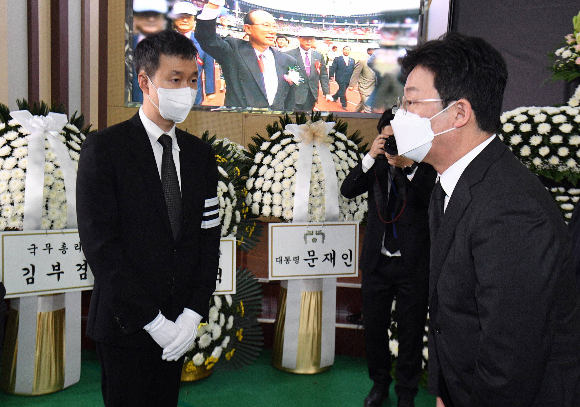 유승민 국민의힘 대선 경선 후보가 15일 서울 여의도순복음교회 대성전 1천 베다니홀에 마련된 고 조용기 원로목사의 빈소에서 조민제 국민일보 회장과 인사하고 있다.