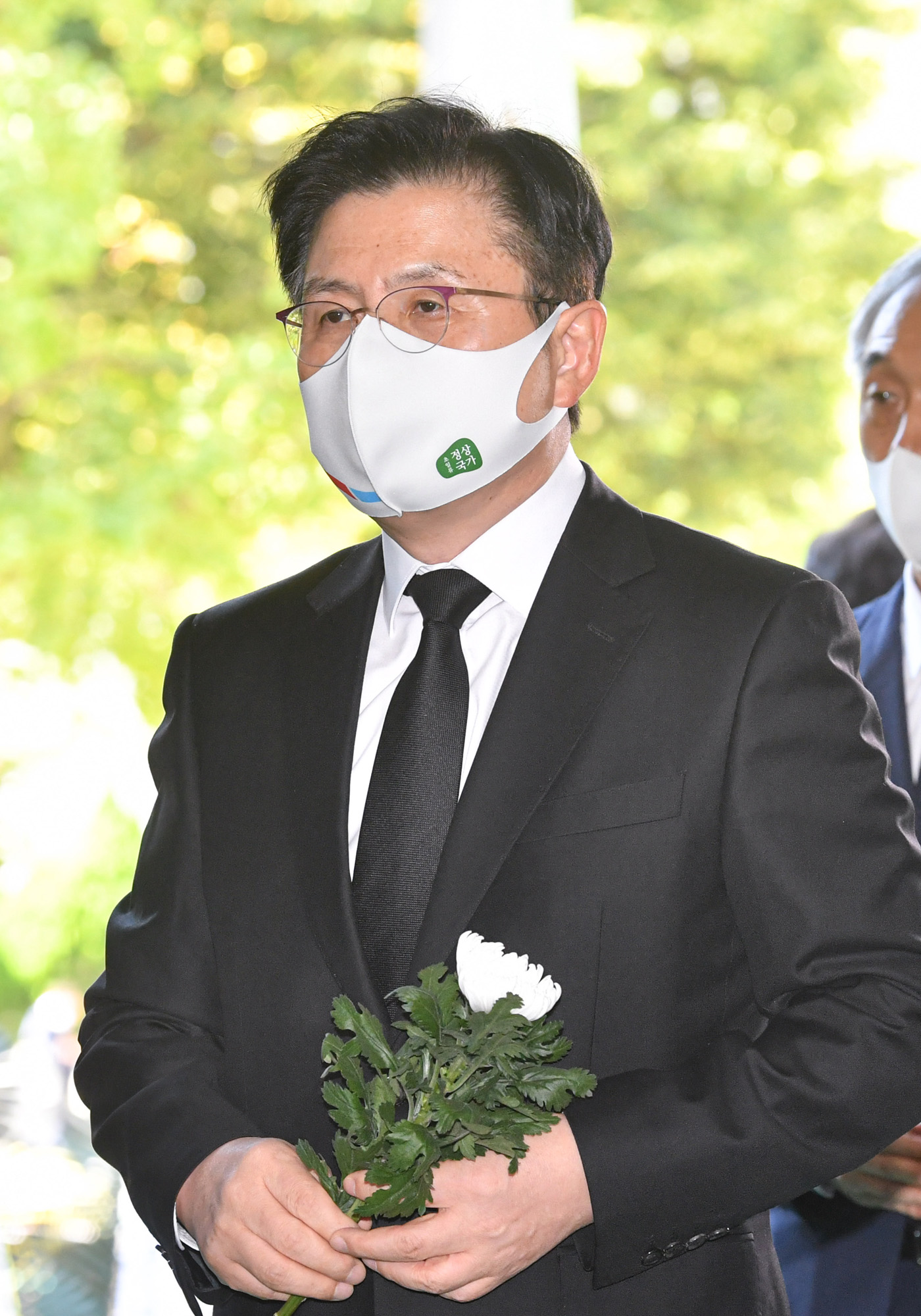 황교안 국민의힘 대선 경선 후보가 15일 서울 여의도순복음교회 대성전 1층 베다니홀에 마련된 고 조용기 원로목사의 빈소에서 조문하고 있다.