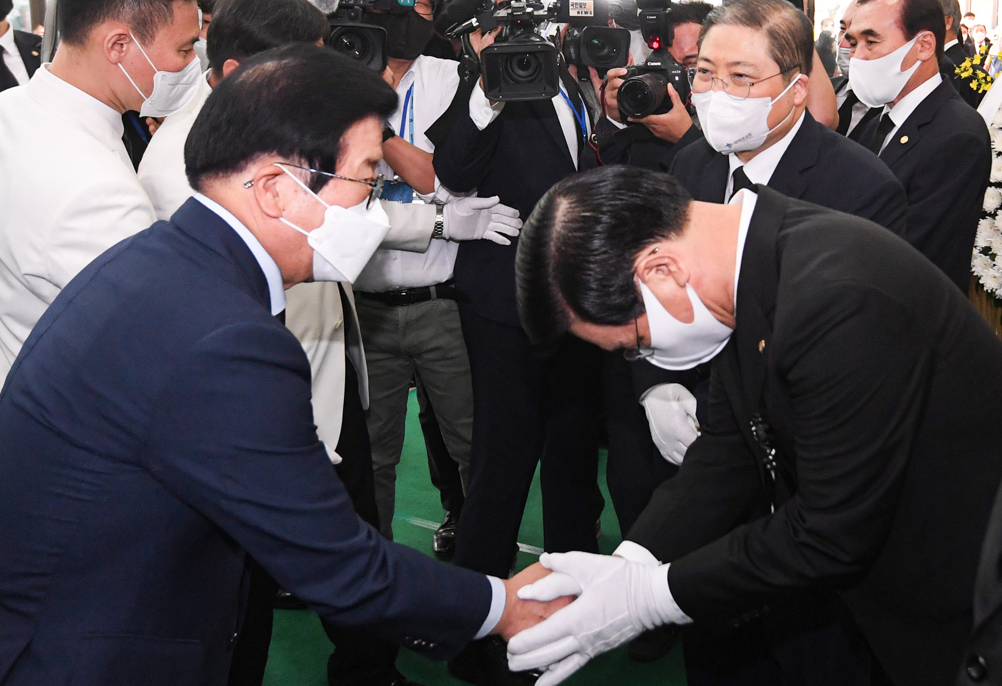 박병석 국회의장(왼쪽)이 15일 서울 여의도순복음교회 대성전 1층 베다니홀에 마련된 고 조용기 원로목사의 빈소에서 이영훈 목사와 인사하고 있다.