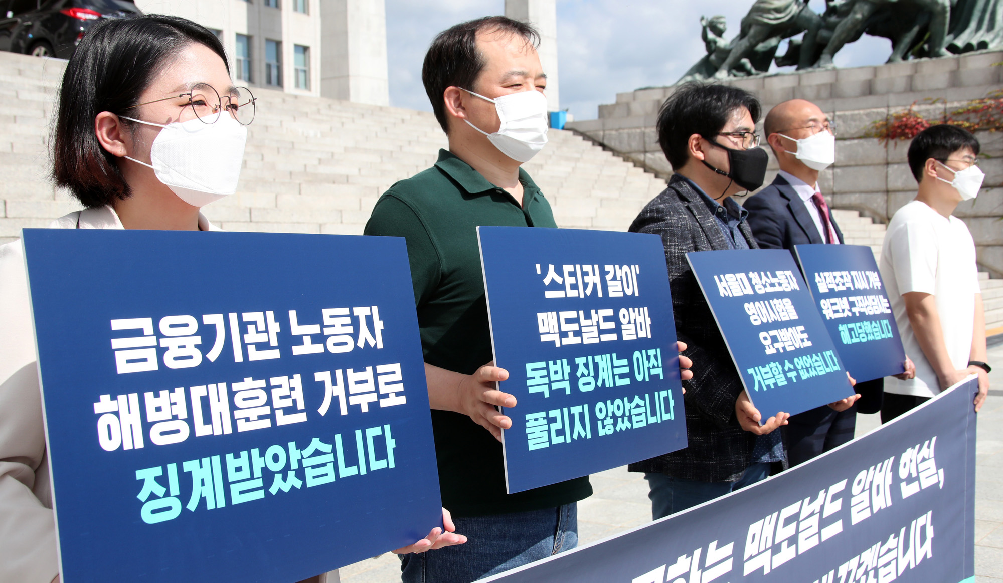 기본소득당 용혜인 의원(왼쪽)이 23일 국회 본관 앞에서 '맥도날드 유효기간조작 사건의 유일 징계자가 알바노동자인 점을 비판'하고 "위법부당 업무지시 징계 금지법" 추진 기자회견을 열고 있다.