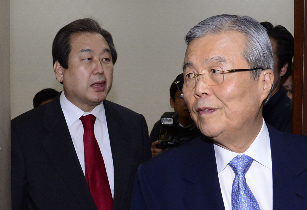 김종인 더민주당 비대위 대표와 김무성 새누리당 대표가 23일 오전 국회의장 면담을 마친뒤 의장실을 나서고 있다. /2016/02/23