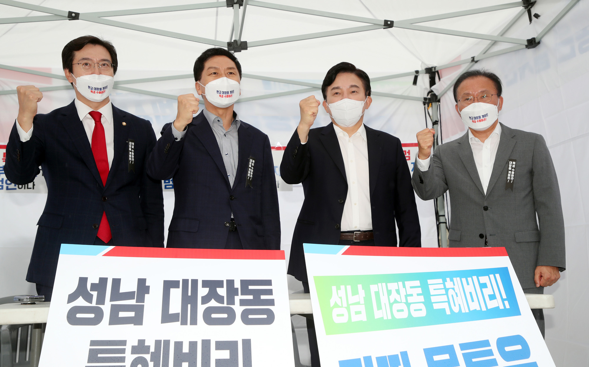 국민의힘 대선 경선 본경선에 진출한 원희룡 후보가 8일 국회 국민의힘 대장동게이트 특검추진 천막투쟁본부를 방문해 농성 중인 의원들과 함쎄 구호를 외치고 있다.