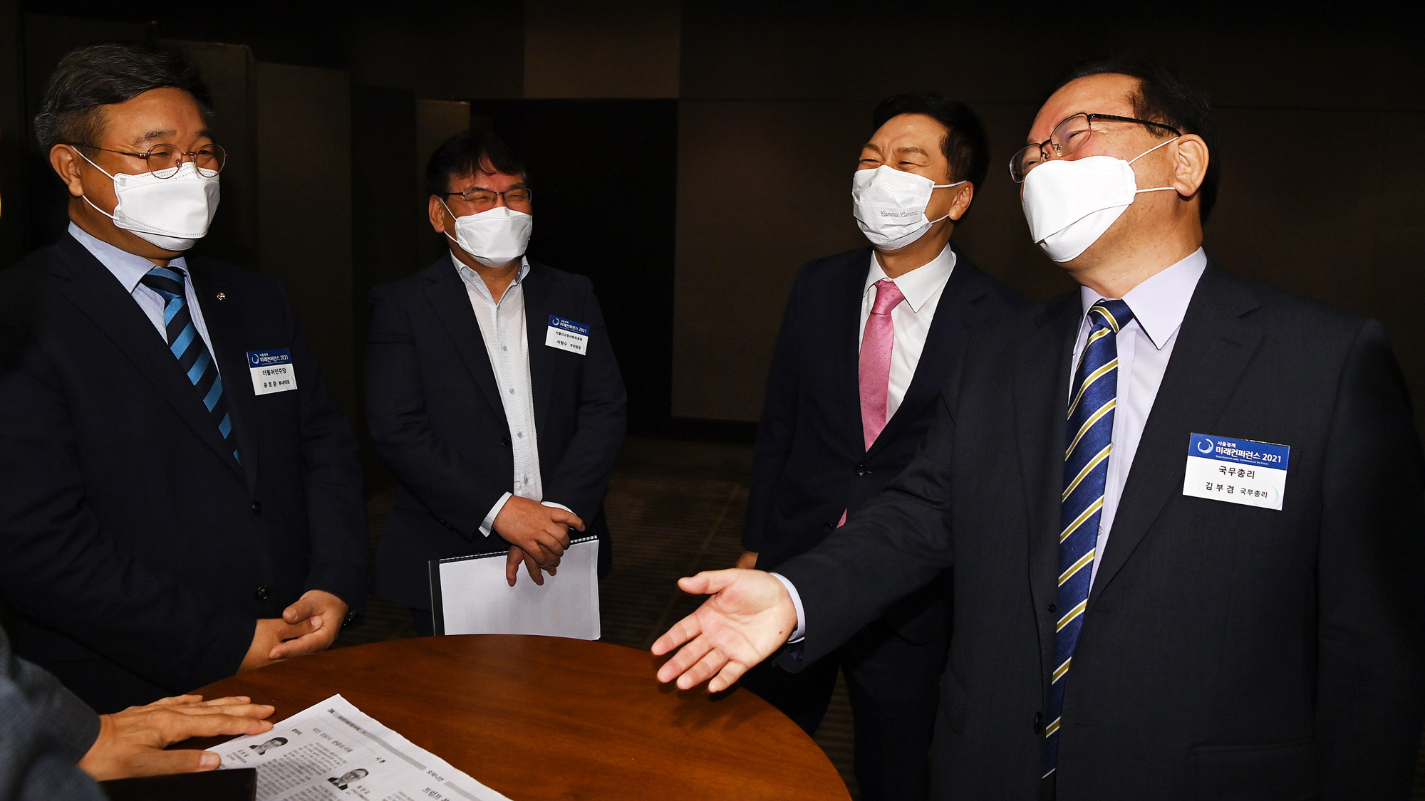 | 사진설명 | 김부겸(오른쪽부터) 국무총리와 김기현 국민의힘 원내대표, 서형수 저출산고령사회위원회 부위원장, 윤호중 더불어민주당 원내대표 등 주요 내빈들이 13일 서울 중구 신라호텔에서 열린 서울경제신문 주최 '미래컨퍼런스 2021'에 참석해 컨퍼런스 시작 전 환담을 하고 있다./서울경제신문 제공 2021.10.13 |