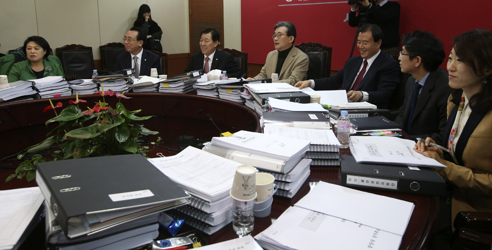 26일 서울 여의도 새누리당 당사에서 대구 중구ㆍ남구 공천신청자 면접이 열렸다. 새누리당 공직후보자추천관리위원회가 예비후보들에게 질문을 하고 있다.