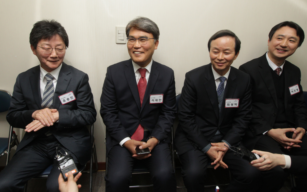 새누리당이 26일 오전 서울 여의도 당사에서 20대 총선 대구·경북 지역 공천 신청자 면접을 실시하는 가운데 대구 동구을 지역 공천 면접을 앞두고 유승민 전 원내대표(왼쪽부터)와 이재만, 최성덕, 허진영 예비후보가 기자들의 질문에 답변하고 있다.
