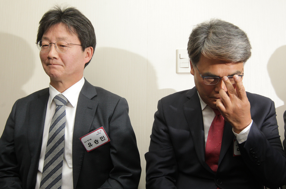 새누리당이 26일 오전 서울 여의도 당사에서 20대 총선 대구·경북 지역 공천 신청자 면접을 실시하는 가운데 대구 동구을 지역 공천 면접을 기다리며 유승민 전 원내대표와 이재만 예비후보(오른쪽)가 서로 다른 표정을 하고 있다.